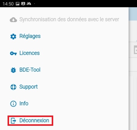 La fonction "Déconnexion" est destinée soit à changer l'utilisateur de l'appareil mobile, soit à verrouiller l'application pour les personnes non autorisées.