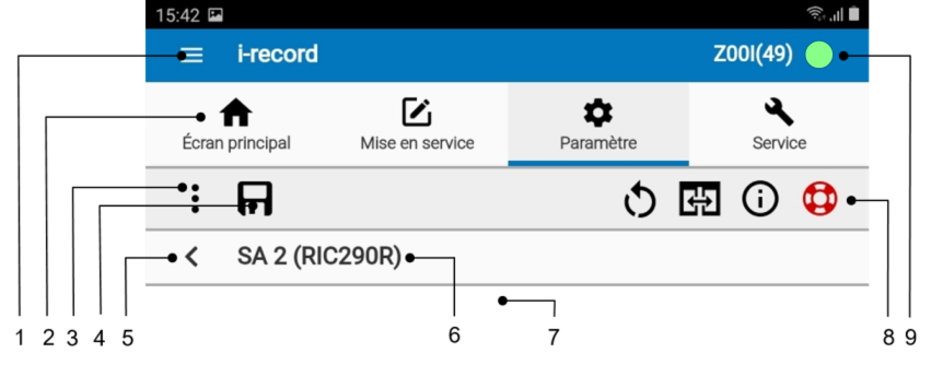 La barre gris clair montre les icônes spécifiques au contexte avec lesquelles les fonctions peuvent être exécutées. Par exemple, une icône de mémoire apparaît sous Paramètres.