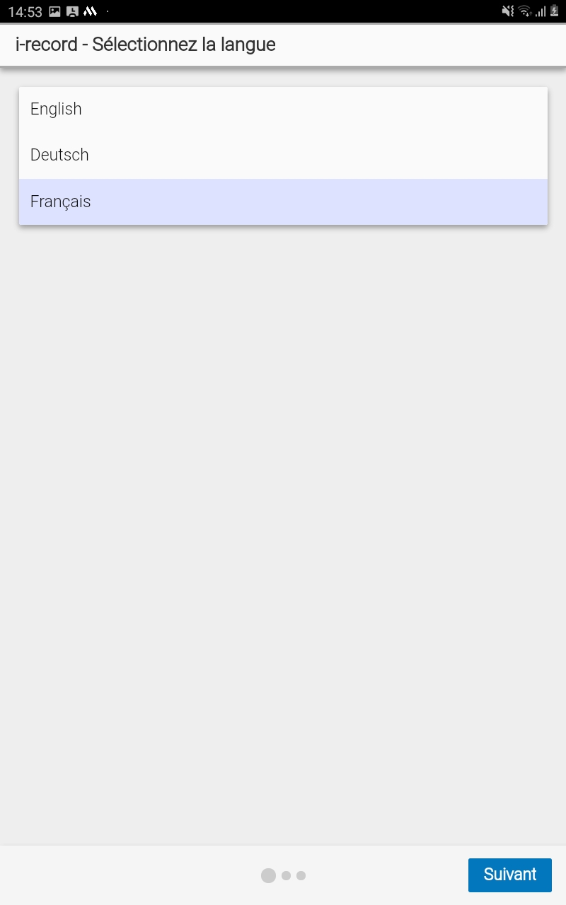 Lorsque l'application i-record est lancée pour la première fois, l'utilisateur est automatiquement guidé par un login initial, qui initialise l'application. Le lien suivant contient une vidéo montrant le téléchargement et l'installation de l'application i-record via le Google Play Store, ainsi que la première connexion.