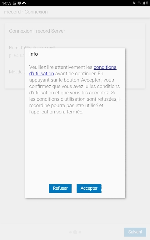 Pour pouvoir utiliser i-record, les conditions d'utilisation doivent être acceptées.