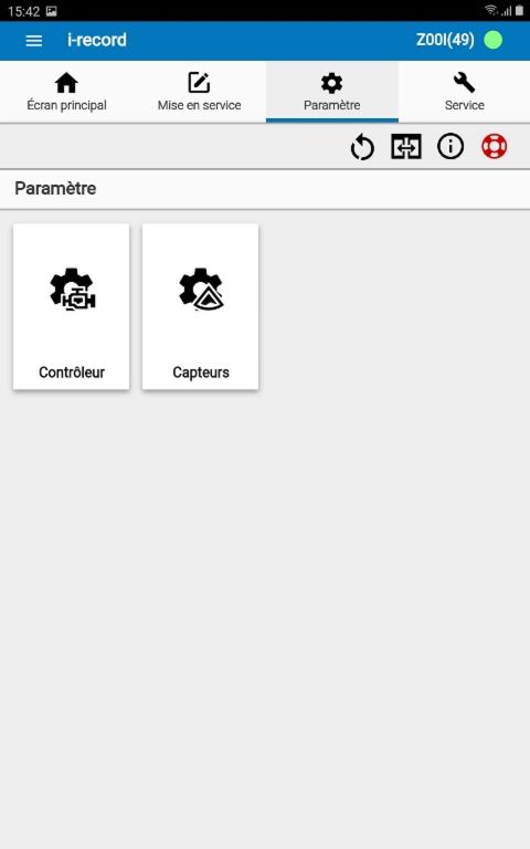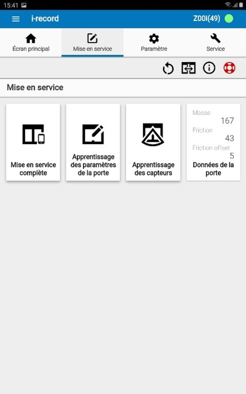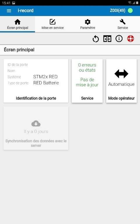 L’écran principal (Accueil) donne un bon aperçu de l'état de la porte. Les informations centrales de la porte connectée sont visualisées ici en un coup d'œil, en particulier le mode opérateur, les erreurs éventuelles ainsi que les mises à jour du logiciel existant. Si l'application i-record n'est pas connectée à une porte, la tuile est active pour la synchronisation des données avec le serveur record.