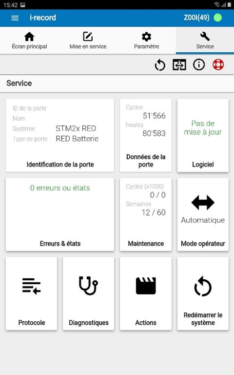 La zone de Service est d'une grande importance pour le technicien. Il y a accès à toutes les informations et fonctions nécessaires pour le service et la maintenance. Les données de la porte, le statut du logiciel, les erreurs actuelles, les compteurs de maintenance et le mode opérateur, entre autres, peuvent être consultés ici. En outre, le logiciel peut être mis à jour, le protocole consulté, les entrées affichées (diagnostic) et diverses autres fonctions peuvent être exécutées.
